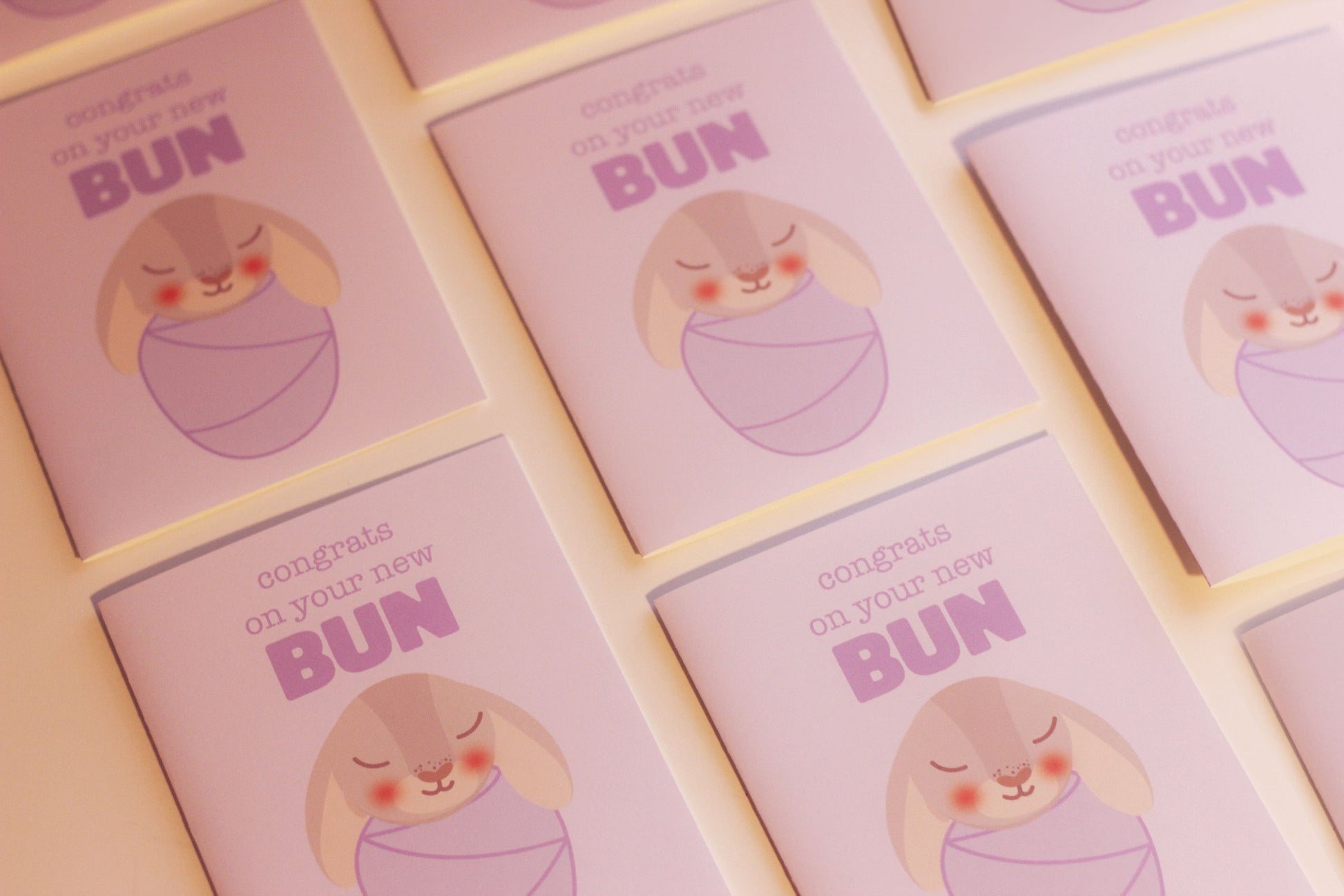 Congrats on your new bun! Give this card to someone who is expecting or just had a new baby. Card is blank inside, and includes an envelope for customization.